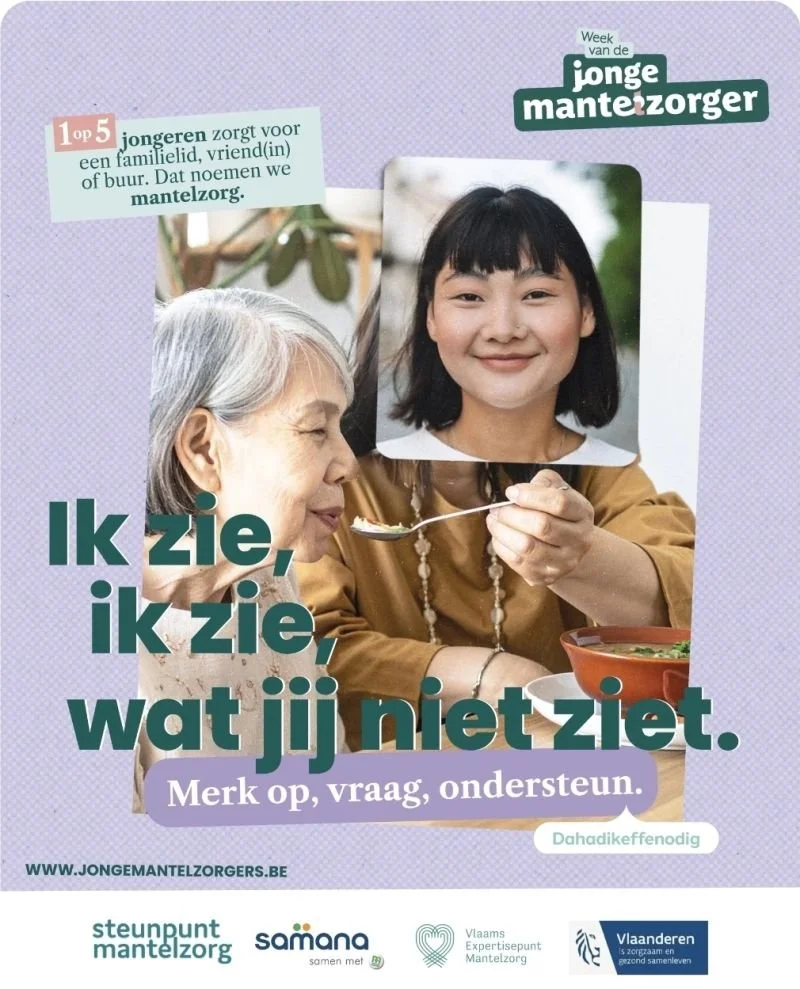 Daarnaast zetten we sterk in op sensibilisering van de brede samenleving. Samen met onze werkgroep van jonge mantelzorgers ontwikkelen, verspreiden en dragen we de Vlaamse campagne voor de Week van de Jonge Mantelzorger uit.